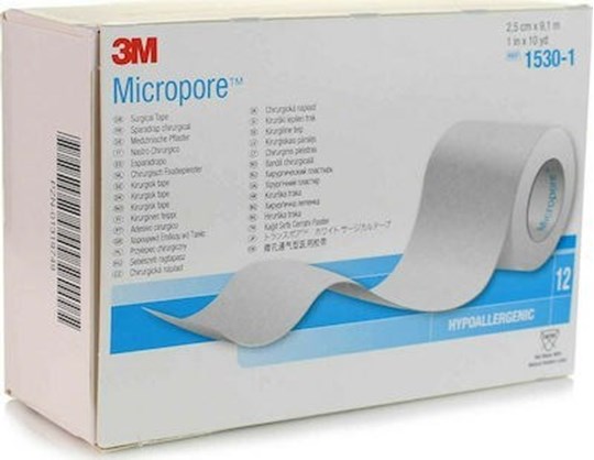 Αυτοκόλλητη επιδεσμική ταινία Micropore από την 3M, η οποία είναι κατασκευασμένη από χαρτί και συγκολλάται απαλά και σταθερά στο δέρμα, χωρίς να αφήνει υπολείμματα κόλλας κατά την αφαίρεση. Είναι υποαλλεργική και δεν περιέχει καθόλου λάτεξ.
