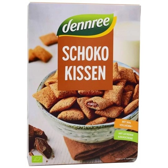 ΜΑΞΙΛΑΡΑΚΙΑ ΓΕΜΙΣΤΑ ΣΟΚΟΛΑΤΑΣ (SCHOKO KISSEN) ΒΙΟ Τα μαξιλάρια σοκολάτα Dennree κατασκευασμένα από πολύτιμα βιολογικά δημητριακά είναι γεμάτα με νόστιμη κρέμα σοκολάτας και παρασκευάζονται από γνήσια μαλακής τήξης ελβετική βιολογική σοκολάτα. Η ιδιαίτερη ποιότητα επιτυγχάνεται από τη χρήση επιλεγμένων πρώτων υλών και εκτεταμένη γνώση της παραγωγής. Το καλύτερο αποτέλεσμα οφείλεται στον ακατατέργαστο καρπό κακάο υψηλής ποιότητας για την αρχική ελβετική σοκολάτα Περιέλουστε με κρύο γάλα τα μαξιλάρια δημητριακών με την ελβετική γέμιση κρέμας σοκολάτας για πρωινό ή για ένα νόστιμο γεύμα. Η απόλυτη τραγανή σοκολατένια γέυση για μικρούς και μεγάλους.