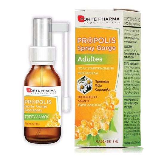 Το σπρέι λαιμού της Forte Pharma Laboratoires εκτός από ισχυρή δόση φυσικής πρόπολης μελισσών περιέχει επίσης πλούσια δόση κατευναστικού χαμομηλιού, μέλι, και ευκάλυπτο.