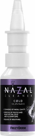 o Frezyderm Nazal Cleaner Cold είναι ένα αποσυμφορητικό που ανακουφίζει από τα συμπτώματα του κρυολογήματος, καθαρίζει τη ρινική κοιλότητα, απομακρύνει τη βλέννα με ωσμωτική δράση, και ελευθερώνει την αναπνοή. Περιέχει Ανθό Άλατος Μεσολογγίου, πλούσιο σε ωφέλιμα άλατα και ιχνοστοιχεία.Επίσης , συγκεντρώνει ένα μοναδικό μείγμα δραστικών συστατικών φυσικής προέλευσης με ευεργετική δράση: Αλθαία που καταπραΰνει τον ερεθισμένο βλεννογόνο, Μανόλια που ενισχύει τη μικροβιακή χλωρίδα, Εχινάκεια που ενισχύει τη φυσική άμυνα του βλεννογόνου, Ευκάλυπτο και Μέντα για αντιμικροβιακή, αποσυμφορητική και ενυδατική δράση.Δεν προκαλούνται φαινόμενα εθισμού και εξάρτησης.Δεν προκαλείται φαρμακευτική ρινίτιδα.Δεν καταστρέφεται το ρινικό επιθήλιο.Δεν προκαλείται αλληλεπίδραση με φαρμακευτικά σκευάσματα.Δεν επηρεάζεται η όσφρηση και η γεύση.