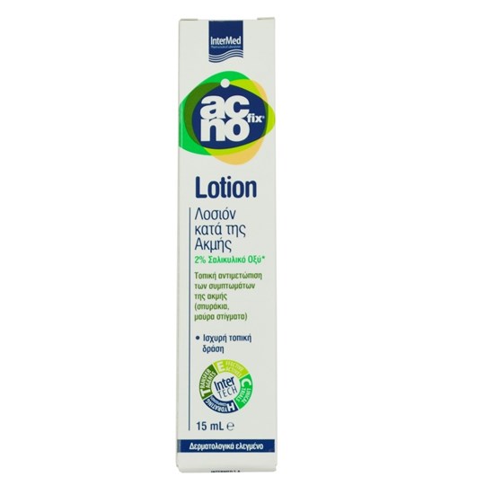 Η Acnofix Lotion με 2% σαλικυλικό οξύ* έχει ισχυρή κερατολυτική δράση και είναι κατάλληλη για την τοπική αντιμετώπιση των συμπτωμάτων τη ακμής (σπυράκια, μαύρα στίγματα). Ειδικά μελετημένη σύνθεση, εμπλουτισμένη με ενισχυτικό παράγοντα διείσδυσης που βοηθάει τo σαλικυλικό οξύ να δράσει σε βάθος, και canadian willowherb το οποίο εμποδίζει την εμφάνιση ακμής και απαλύνει την επιδερμίδα.