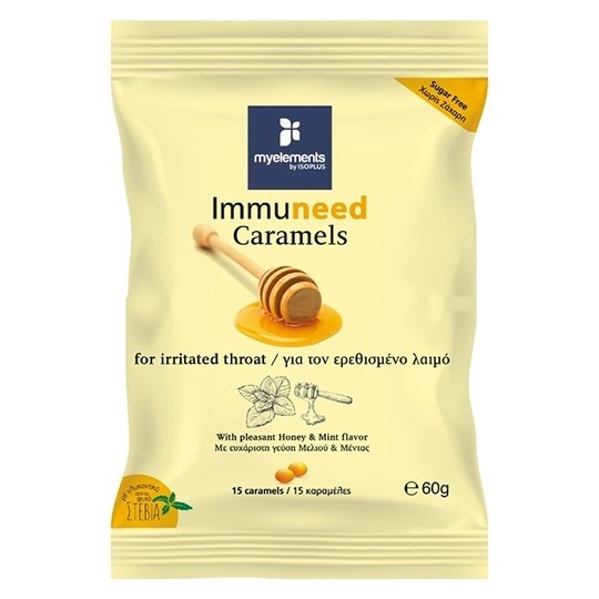 MyElements Immuneed Caramels Καραμέλες για τον ερεθισμένο λαιμό με ευχάριστη γεύση Μελιού και Μέντας, χωρίς ζάχαρη με γλυκαντικό από το φυτό στέβια.