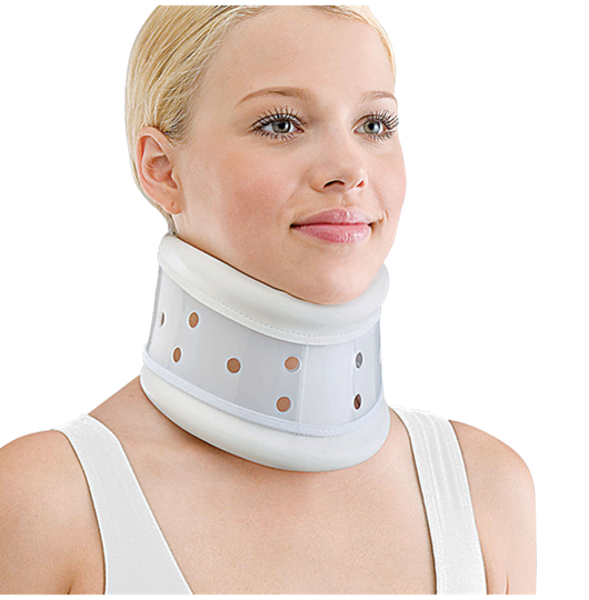 Κολάρο δύο τεμαχίων, από πολυαιθυλένιο με οπές αερισμού. Φινίρισμα από μαλακό αφρώδες υλικό (foam), επενδεδυμένο με δερματίνη. Το ύψος ρυθμίζεται με velcro. Οπίσθιο αυτοκόλλητο κλείσιμο. Στηρίζει τον αυχένα σε ουδέτερη θέση. Ακτινοδιαπερατό