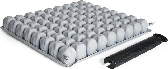 ο µαξιλάρι "air cell" αποτελείται από δύο τµήµατα, (αεροθαλάµους), που ενεργοποιούνται αυτόνοµα, αναλόγως της πίεσης του σωµατικού βάρους. Ο ανατοµικός σχεδιασµός βελτιώνει την όποια αστάθεια της λεκάνης και του κορµού. Η άνω επιφάνεια του καλύµµατος, λόγω της υφής της, επιτρέπει στις αεροκυψέλες να ενεργούν ανεξάρτητα και να προσαρµόζονται στο σχήµα του σώµατος. Η βάση του καλύµµατος είναι αντιολισθητική και σταθερή. Στην συσκευασία περιλαµβάνεται ειδική τρόµπα αέρα. Υλικό: Medical PVC.